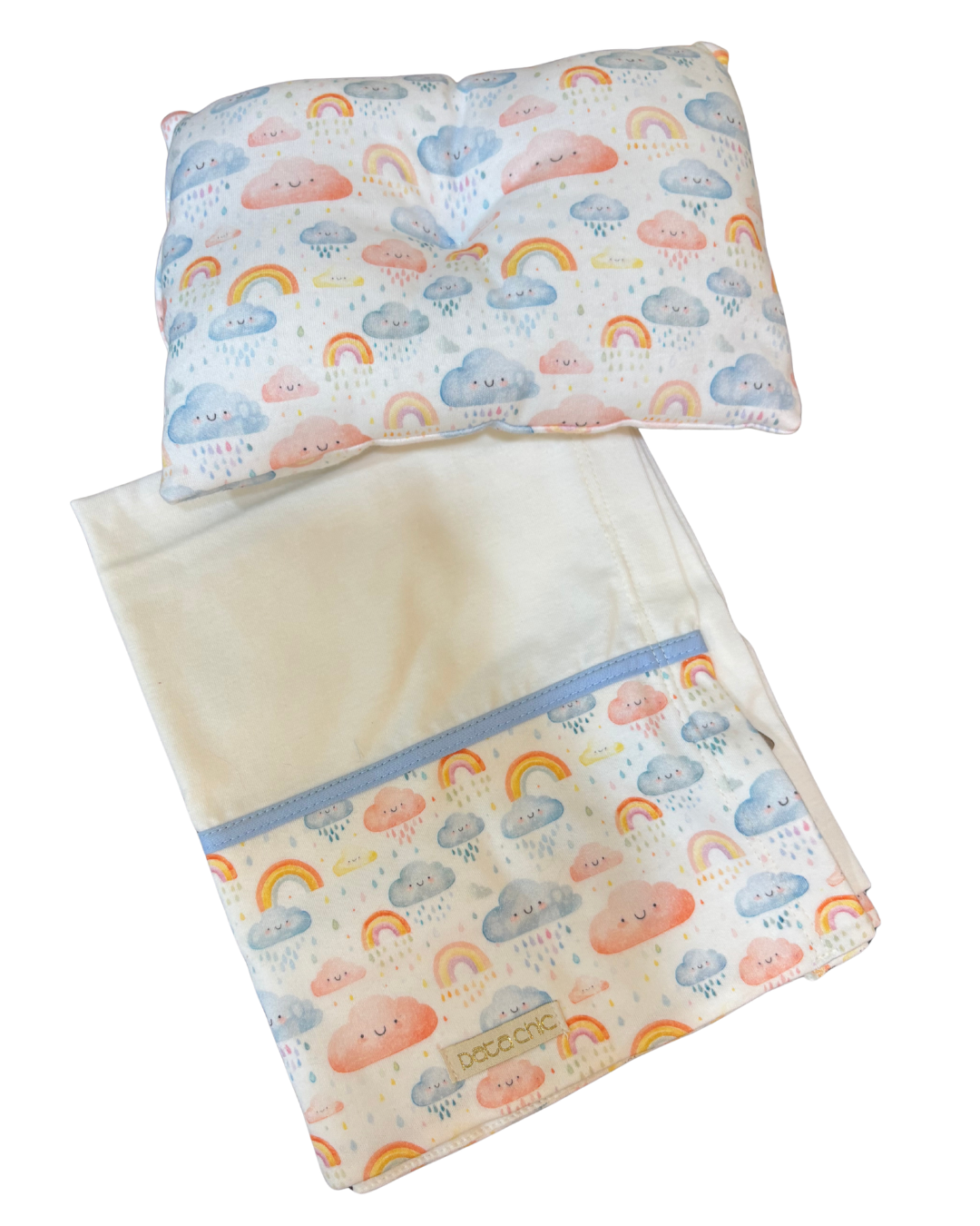 O kit é produzido em tecido leve, que ajuda na ventilação da pele do pet, sem causar irritação. A peça apresenta estampa suave com detalhes coloridos que deixam o ambiente mais alegre. Seu tamanho e formato se adaptam bem à maioria das camas pet, garantindo praticidade no uso.