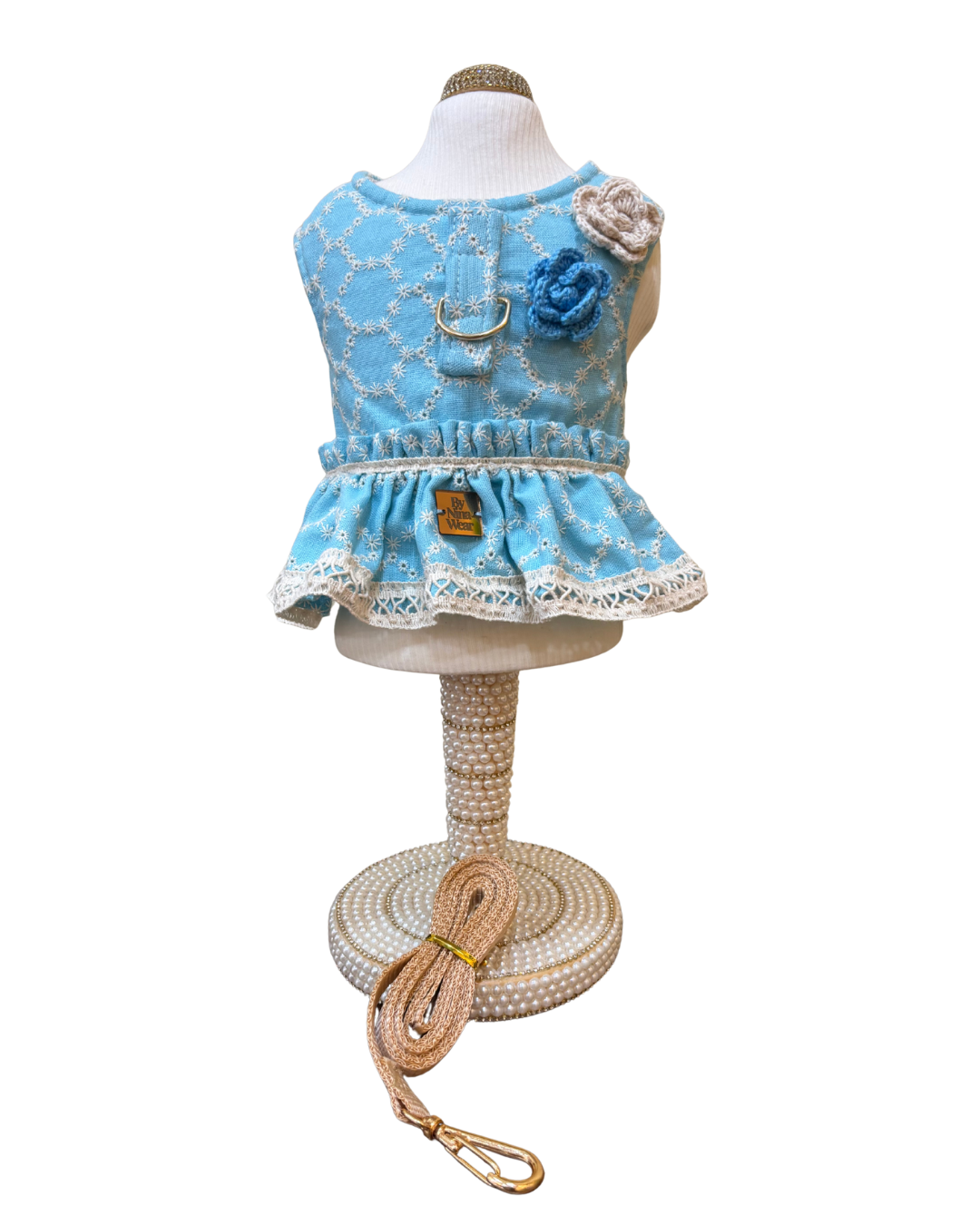 Medidas ajustáveis garantem a adaptação a diversos portes de cães pequenos e médios, valorizando a estética com sua saia decorativa e aplicação de flores feitas à mão, transmitindo elegância e charme para seu pet.