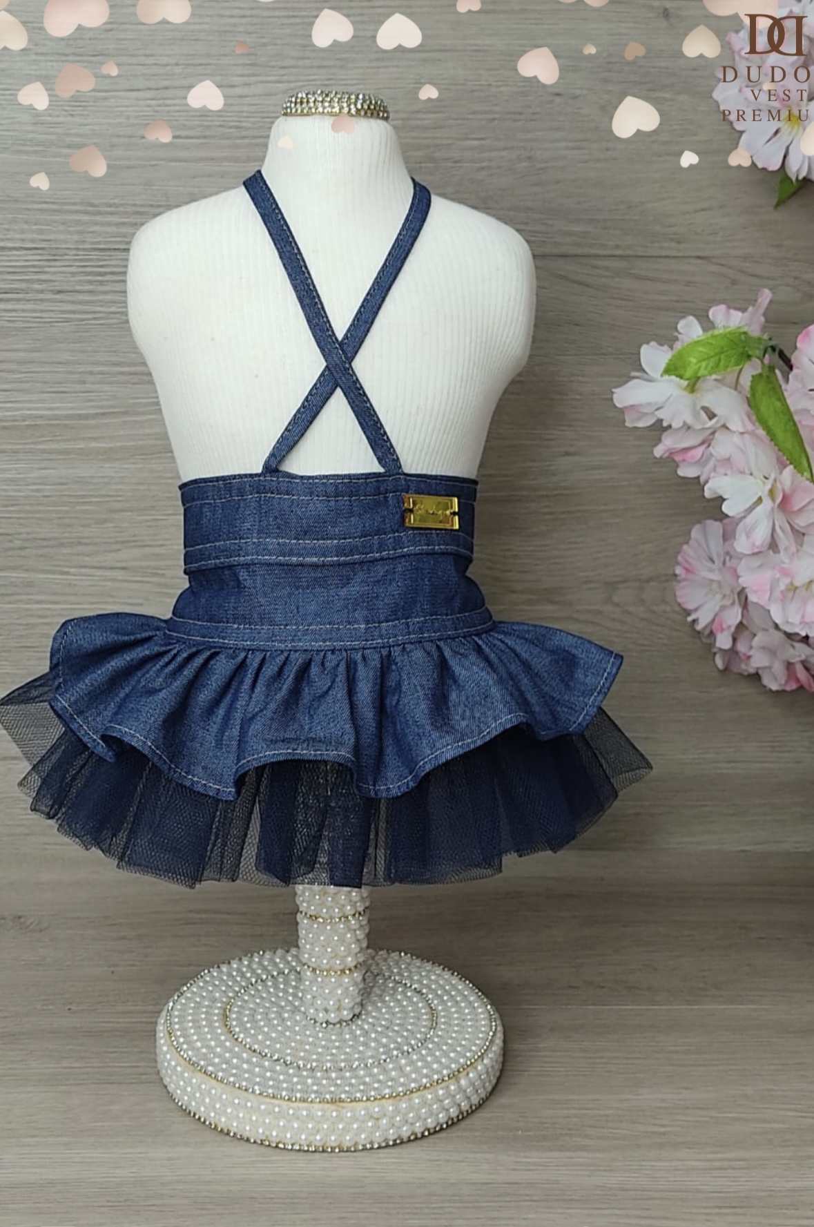 Em jeans bem levinho com armacão de tule