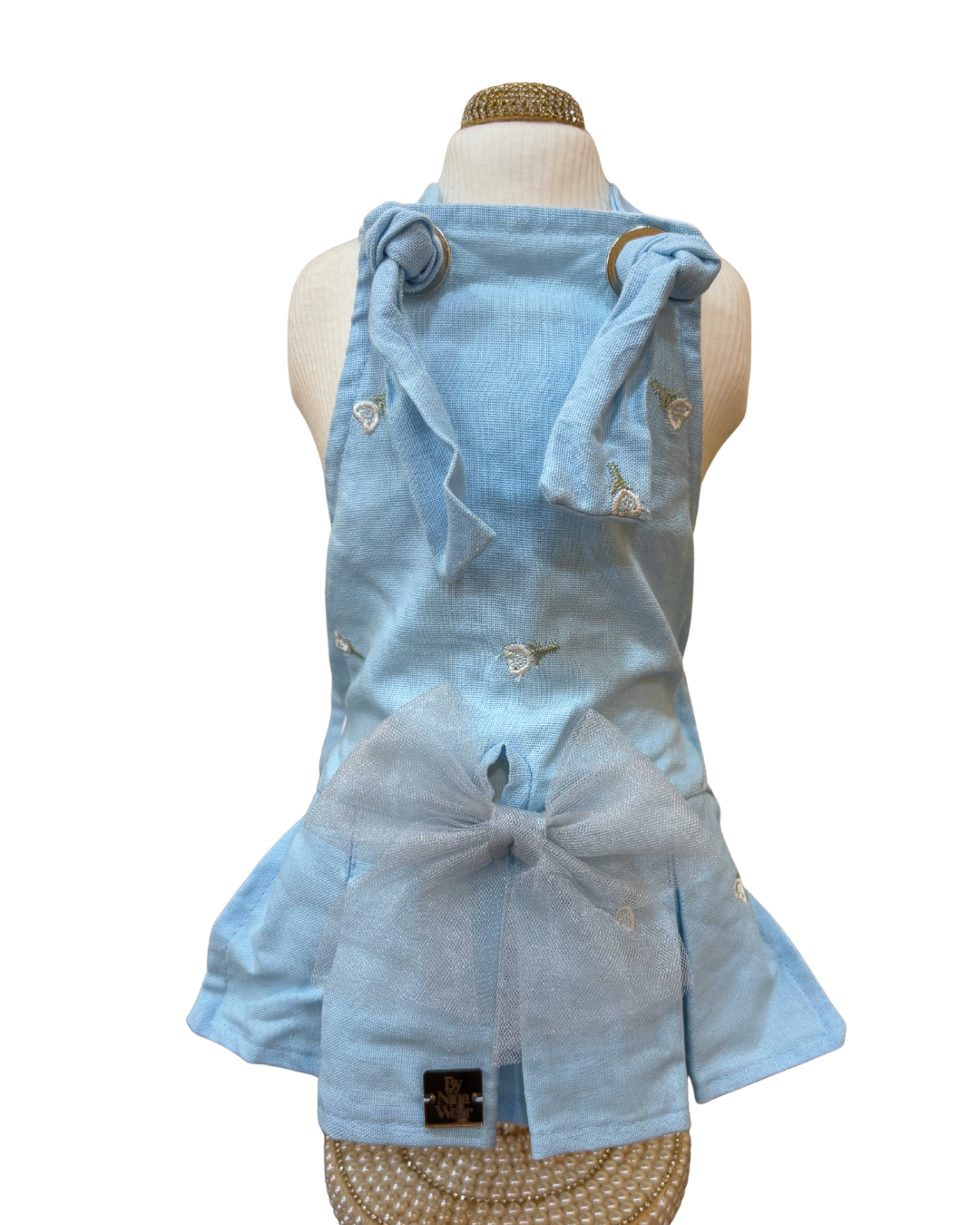 Seu design inclui bordados delicados e laços que trazem charme, inspirados na leveza do litoral. A peça possui fechamento frontal com botões, facilitando o uso e ajuste ao corpo do animal. É perfeita para cães que precisam de uma roupa confortável, elegante e prática no dia a dia.