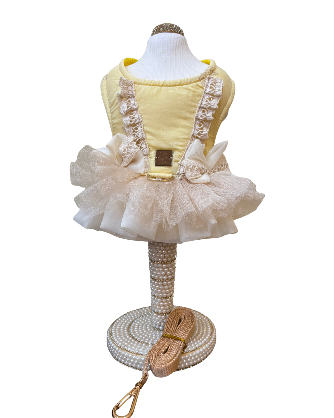 Medidas ajustáveis garantem a adaptação a diversos portes de cães pequenos e médios, valorizando a estética com sua saia decorativa e aplicação de flores feitas à mão, transmitindo elegância e charme para seu pet.